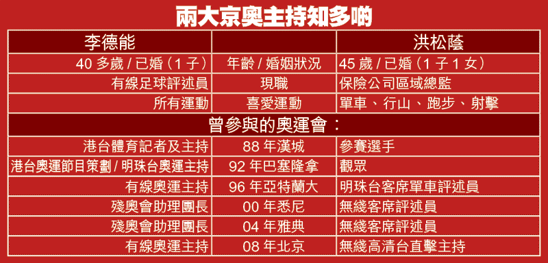 京奧魅力,造就了李德能與洪松蔭不約而同在今年出書──《金牌背後》及《松頭再來》。這兩位老朋友,8月將為不同電視台做京奧主持。23年前,德能是港台體育節目主持,阿松是4屆「全港單車總冠軍」,當時德能邀請阿松到港台做客席主持。20多年下來,德能現時是個家喻戶曉的足球評述員,阿松就當上保險公司區域總監。但兩人今夏都一同向京奧進發。記者:徐嘉華 攝影:黃賢創、黃冠華