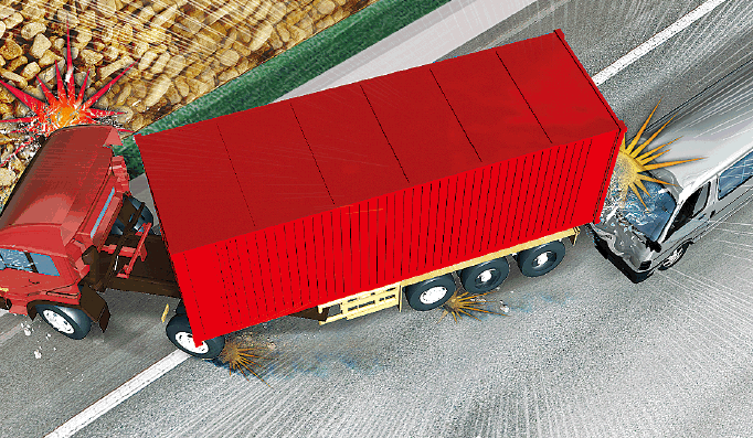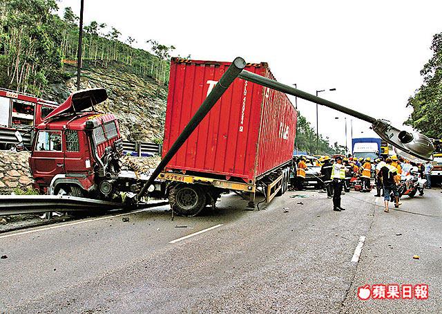 意外發生在昨晨8時許,41歲姓何司機駕駛着貨櫃車沿屯門公路慢線往新界行駛,至近小欖沙倉時疑天雨路滑失控,越線撞向右邊防撞欄,掃毀15米長欄杆及一支燈柱,車尾橫亘路中。此時一輛客貨車駛至收掣不及,車頭陷入貨櫃車尾全車七人全部浴血。