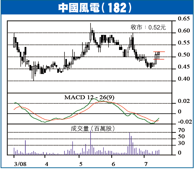 環保能源股開始有勢,另一家有機會成為風力發電龍頭企業嘅中國風電集團(182),亦高收0.52元,逆市而升1個位,個勢好靚,重上10日同20日線之上,MACD亦出現熊牛入貨訊號,在0.50元水平的旗形整固完成後,一破位而上,第一個目標係0.59元,但揸一年半載,股價有機會升一個開。去年中,中國風電就曾上過1.40元。