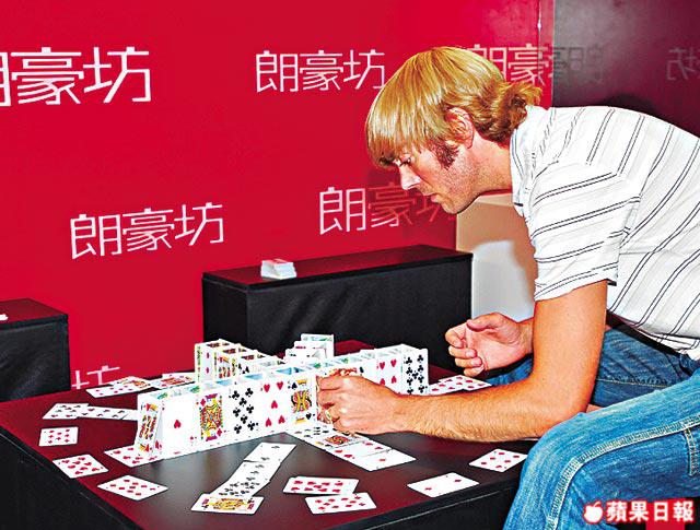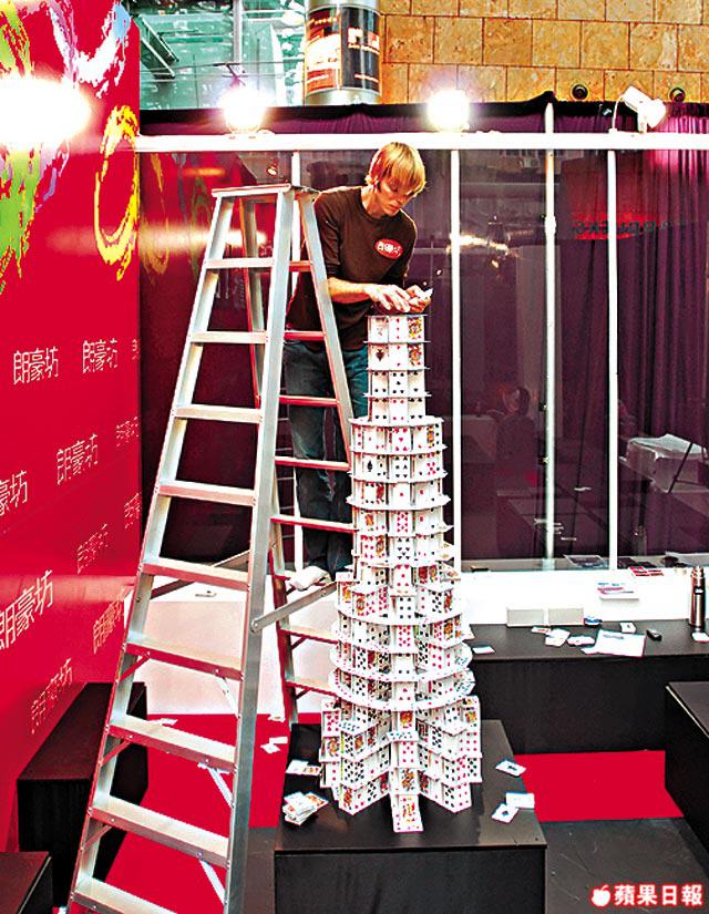 自小沉迷砌啤牌的Bryan絕非不學無術,他是大學建築系的講師,更於哈佛大學取得設計碩士。他是全球唯一啤牌建築師,更是兩項健力士世界紀錄保持者,分別是「世界面積最大的啤牌建築物」,他還三度創下「世界最高啤牌建築物」的紀錄,於2007年成功砌出25呎10吋高的摩天大廈。Bryan砌過睡公主城堡、大教堂、日本廟宇、金字塔……等等,字典內是否沒有Impossible這個字?「基本上所有建築物我也可用啤牌砌出來,我還想試砌大橋。不過曾經有人邀請我砌紐約自由神像,但手臂伸出來的位置沒有支撐,想不出解決的方法,應該是少數不能用啤牌砌出來的建築吧!哈哈!」首次踏足日本以外的亞洲城市,Bryan亦抽空到尖沙嘴海旁走,「對岸中環的Skyline很美,有很多高而且有特色的建築物,好似匯豐銀行的結構與蜂巢的設計很相似,我彷彿已經想像到怎樣砌出來,希望下次有機會砌香港的Skyline!」計劃多多的Bryan,接下來還打算建一坐高達100呎的啤牌塔再破紀錄。