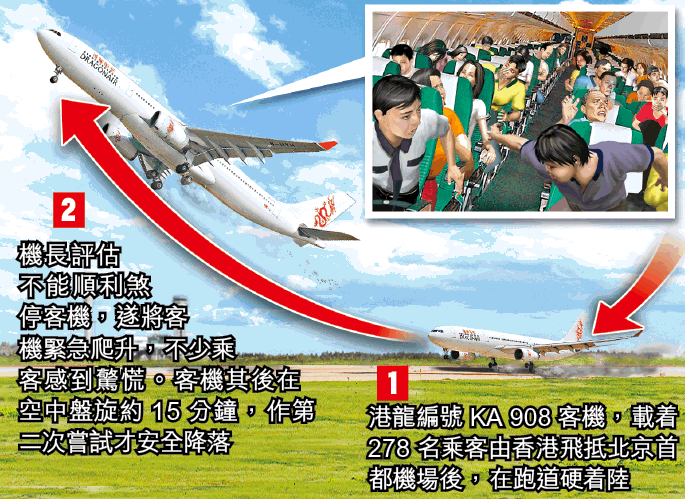 該架編號KA908的港龍空中巴士A330型客機,昨午12時14分由本港起飛,約三時許抵達北京。當客機降落時卻來了一次「硬着陸」,機輪重重壓在跑道,機長隨即將客機作緊急爬升,然後在空中盤旋。