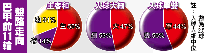 然而,巴甲過往給人「大」手交易的印象,今季卻截然不同,目前開「大」比率僅47%,捧場客需當心;此外,入球單雙的分佈則有明顯俱別,開「單」有44%,「雙」則維持在56%,這與和波比率上升有關,球迷可多加留意。文:阿呢斯奧