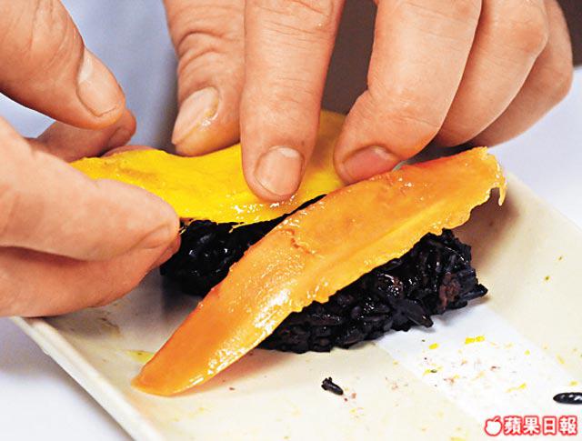 3.把黑糯米握成壽司狀後放在碟上,將芒果及木瓜片鋪在黑糯米上。