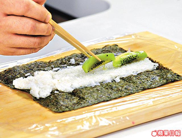 2.奇異果去皮切條。在枱面鋪上保鮮紙及紫菜1片,在紫菜中間鋪上糯米及奇異果後捲起。切去卷頭卷尾後,平均切開六份。