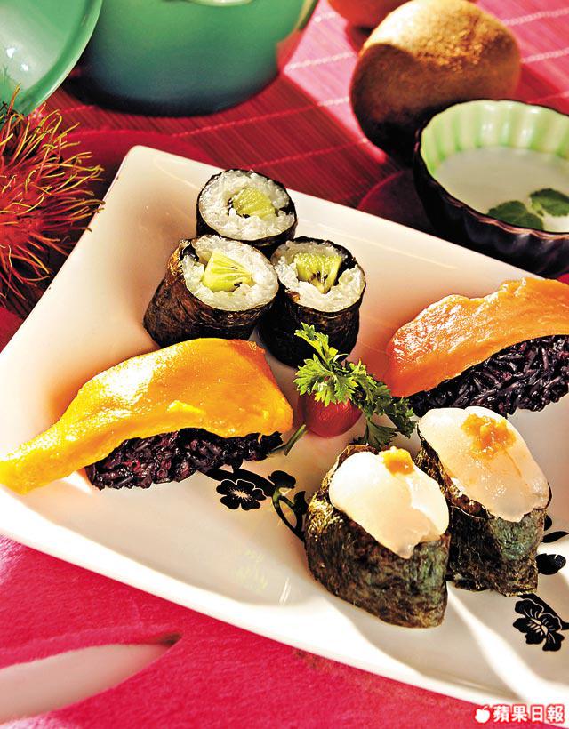 3.紅毛丹切片;剩餘的紫菜剪成約4吋長、1吋闊粗條,把糯米握成壽司狀,將紫菜圍在邊做成軍艦型壽司,放上紅毛丹片,上面放木瓜茸作裝飾。隨個人喜好,可蘸上椰漿享用。