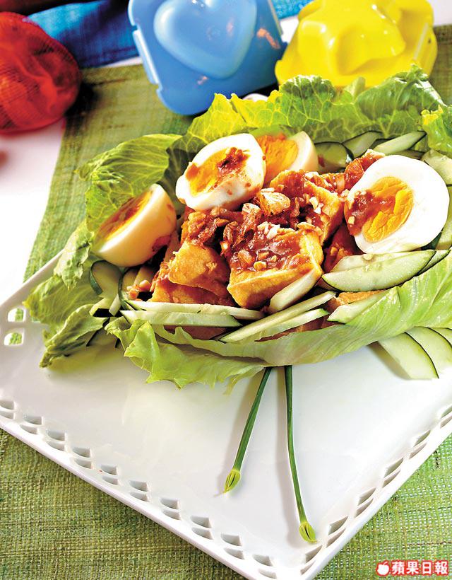 板豆腐1磚、西生菜1/2個、雞蛋2隻、青瓜1/2條、花生碎/亁葱碎各適量、加多加多(印尼醬料)100克、熱水80毫升