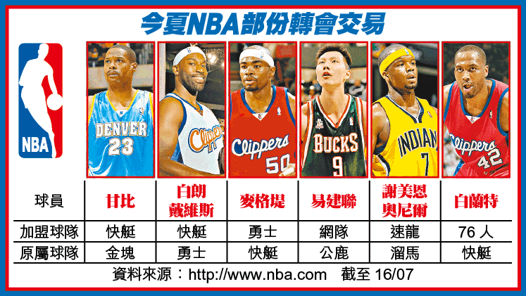 【綜合美國外電】NBA球隊洛杉磯快艇繼送走陣中的白蘭特及麥格堤,並從勇士得到白朗戴維斯之後,周二再與金塊達成協議,以2010年的第2輪選透權作交易,換來內線防守悍將甘比;快艇在短短的一周內,已進行了4個重磅交易,成為至今轉會市場上「交投」最活躍的球隊!