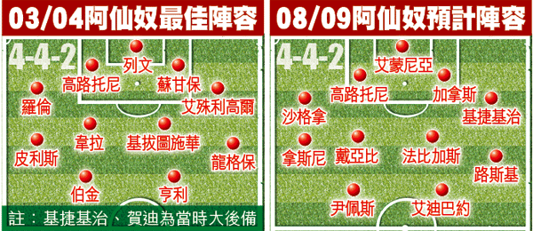 當季,老臣子基昂隨即遭棄用,接着兩季輪到隊長韋拉和艾殊利高爾被賣走,而近代球會英雄「冰人」伯金亦於05/06球季結束後高掛球靴,告別賽更是場面感人;去夏,震動歐洲球壇的當然是亨利以1,600萬鎊加盟巴塞,而今夏就到老將基拔圖施華,繼希比、法米尼和列文後,第4名離隊的球員,同時令5年前的不敗之師僅餘下27歲的高路托尼。