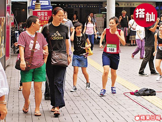 他們跑得大汗淋漓,其間,有人抽筋跌倒,在群眾加油聲中站起來;也有作狀向途人要水,途人也作狀為他們潑水降溫;兩位孟加拉居港旅客,更主動拉終點繩子見證衝線。比賽絕不馬虎,頒獎儀式一樣有,借用了海港城頒獎台,運動員展示獎牌與特區區旗歡呼:「請大家支持北京奧運。」自由行旅客爭着與他們合照留念,小朋友拍手和應,短短十分鐘比賽,縱偶有管理處職員阻撓,最終亦順利完成。