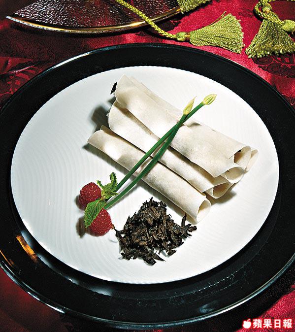 用麼麼(食片皮鴨的白色薄餅)包着以金華火腿絲炒香的干巴菌略蒸,干巴菌有股香薰味,入口juicy軟滑