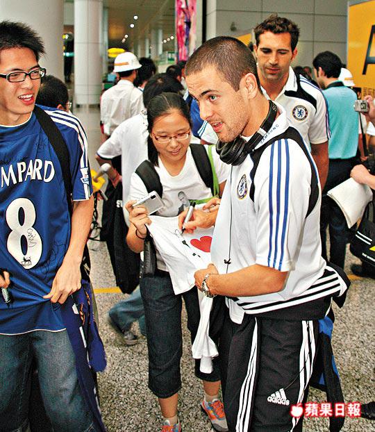 連同職員,車路士昨晨7時15分乘坐包機飛抵白雲機場,現場接機的球迷不多,大約只有20多人。首先步出接機大堂的林柏特,主動走向球迷簽名,隨後的施治、領隊史高拉利亦有仿效。早上5時起床追星的陳先生說:「『大菲』好友善,他見我兒子穿上巴西國家隊球衣,更舉起手指公講『Verygood!』」