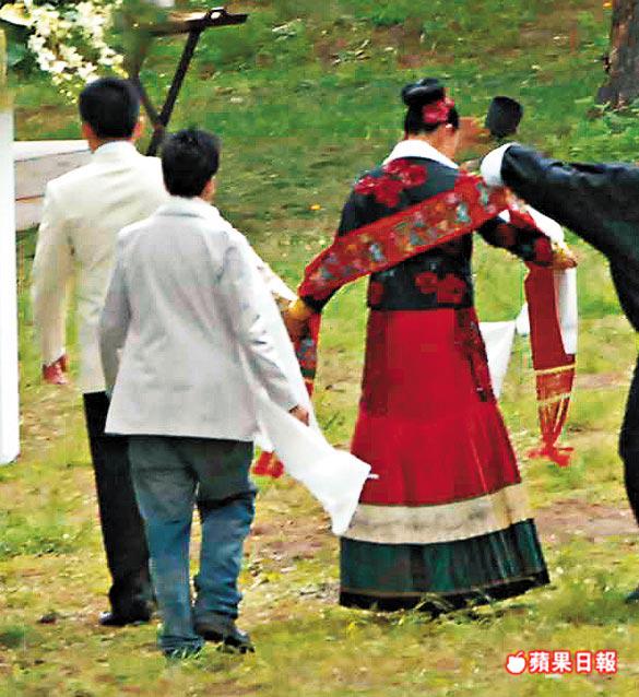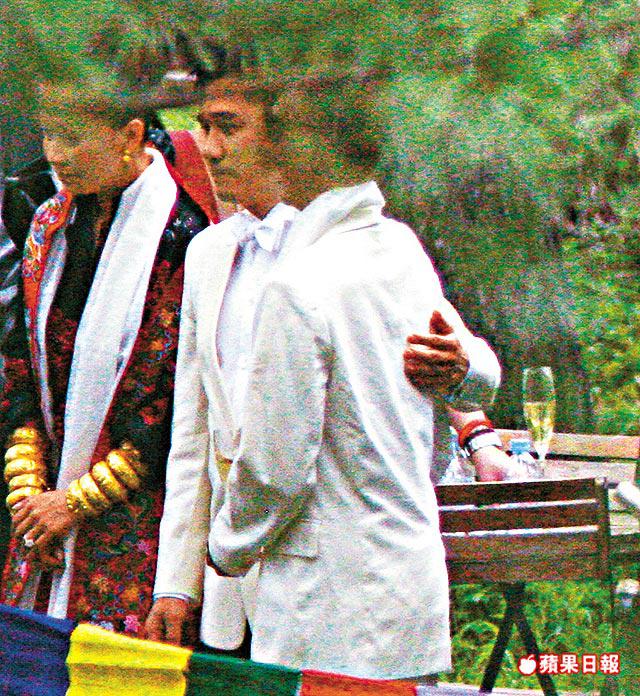 新娘子嘉玲昨日在婚禮上除了穿上VeraWang的婚紗外,還換上另外一套不丹的民族服裝出現,這套印上小花圖案的紅彤彤長外套式民族服,配上一條象徵祝福的白色哈達,再加上嘉玲兩手共戴了五對重甸甸金鈪,既有藏族民族味,又不失中國傳統,甚具特色。