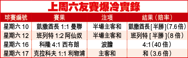 捧紅魔失利,轉捧阿仙奴的球迷同樣贏得險,兵工廠作客班列特先負0:1,又爆冷開出主隊8倍「半勝」;幸好換邊後分別憑森遜及巴拉薛廸建功,最終反勝2:1保1.22倍熱W。就連利物浦亦僅迫和克拉科夫1:1,同失1.57倍W。