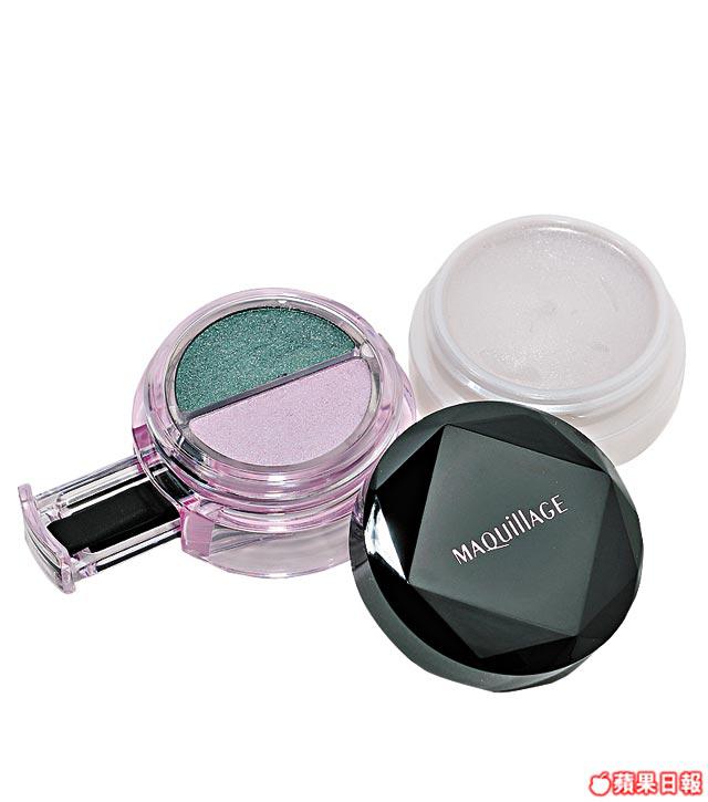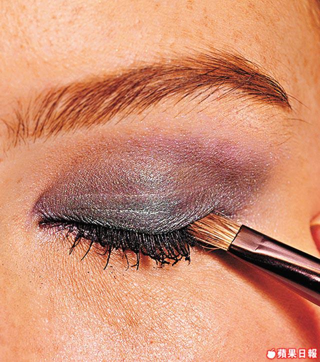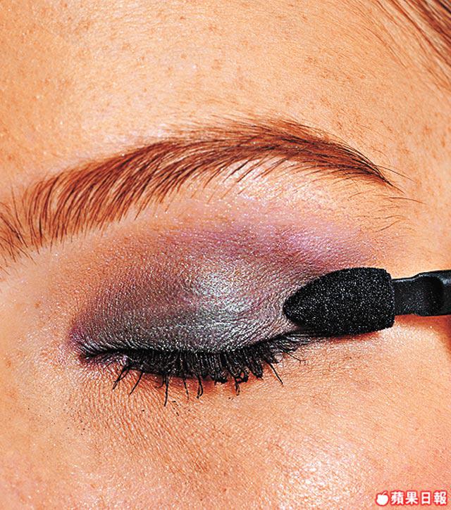 2.眼窩位掃銀白色Base、雙眼皮位掃淺粉紫色眼影和睫毛根部掃墨綠色眼影。