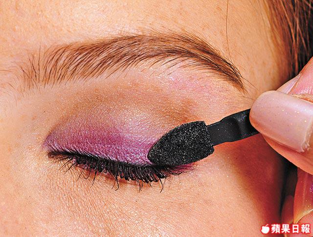1.眼窩位掃淺粉紅色Base、雙眼皮位掃金黃色眼影和睫毛根部掃紫色眼影。