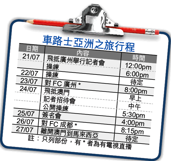 今次車路士的「亞洲之行」將進行3場友賽,首仗將會是在廣州對FC廣州;緊接的將會是到澳門迎戰FC成都,最後是飛往馬來西亞與當地的明星隊對決。