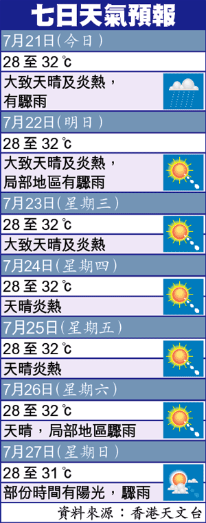 受到一股西南氣流影響,天文台預測今日及未來數天大致天晴及炎熱,局部地區有驟雨,吹和緩西南風,氣溫介乎28至32度。