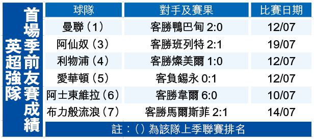 陣容方面,車路士有前鋒杜奧巴及比沙路因傷未有隨隊,「小登科」的中場波歷克料在下站澳門才歸隊,後衞保拿奴斯及中場馬基列尼則已轉會,但陣中仍猛如雲,包括施治、泰利、艾辛、林柏特、廸高及舒夫真高等,整體實力遠在FC廣州之上。此外,英超強隊在首場友賽都有好成績,6戰取5勝1負,其中曼聯、阿仙奴及利物浦都旗開得勝(見附表)。