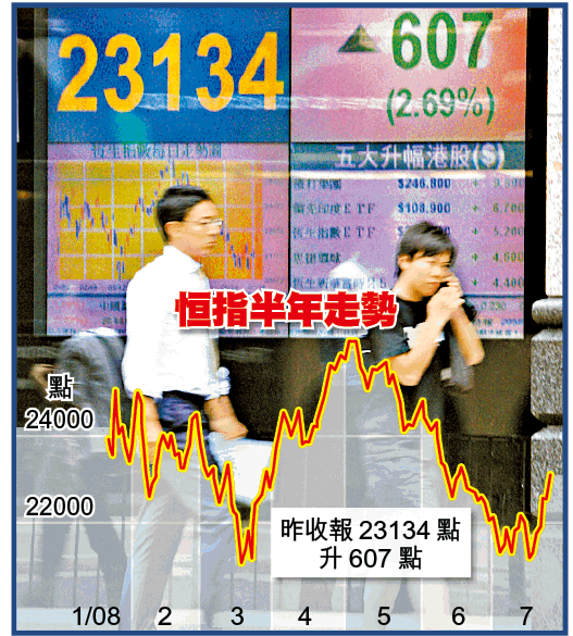 謝明光估計,港股周內有機會再試6月初下跌裂口底部23400,惟要一口氣衝上24000,則有賴中移動及兩大油股。星展唯高達證券董事黎永良同意,市場信心改善,短期料先在23000反覆,近日基金開始重新入市,港股貨源漸漸轉到強者手中,9月前再試24000,第三季大市有「小陽春」。另外,富邦香港(636)第一副總裁潘國光預期,美國今年或加息一次,幅度25點子,但對香港樓市影響有限,港股下半年料於21000至25000點上落。