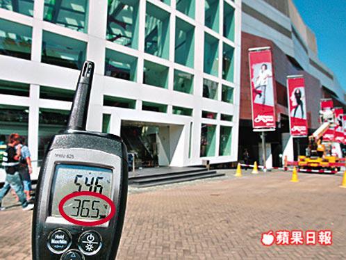 九龍塘又一城商場,一門之隔溫度相差近12度。記者於昨午2時到又一城測量室內外氣溫,發現市民於室外攝氏36.5度高溫下滿身汗水地急步進入只有攝氏24.6度的商場「凉冷氣」,一熱一冷,容易患上傷風感冒,甚至奪命的肺炎。專家指小孩出汗後應抹亁汗水才進入商場。