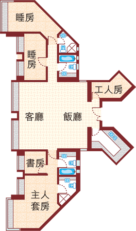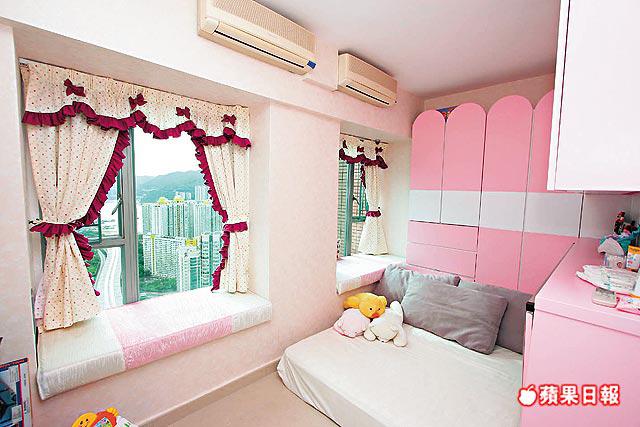 單位間隔改動特別之處是,自製主人套房連書房,令私人獨立空間得以擴大,而睡房床下部份地台升高,可貯存大量物品,慳位實用。另外,兩個睡房,則佈置成小朋友房,其中一個為原裝套房設計,面積寬敞,景觀同望汀九橋海景。