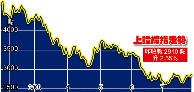 【本報訊】油價急回、外圍吹暖風及官方輿論再出口術,內地股市連跌兩日後重振「升」勢,彈高逾2%。滬綜指收報2910點,升2.55%,深綜指則彈2.43%,收866點,同為兩周以來最高位。兩市總成交額增加至1142億元人民幣。 記者:黃武榮