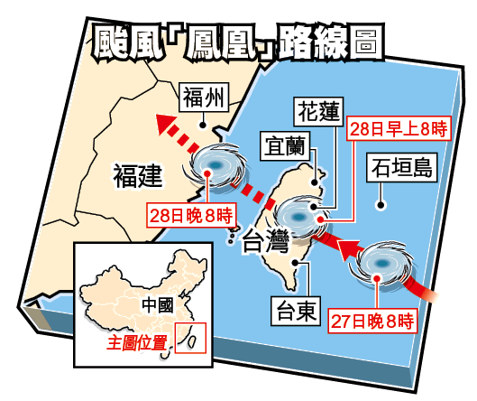 繼「海鷗」早前重創台灣中部後,颱風「鳳凰」昨日逼近台灣,風力持續增強,並帶來暴雨。台灣氣象部門預計,中度颱風鳳凰最快今晨在花蓮到台東一帶沿海登陸,將成為今年最強的颱風,台東可能出現焚風。預計晚間至明晨,轉吹福建,在連江至廈門之間登陸。