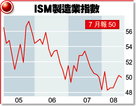 供應管理協會(ISM)亦公佈,消費者減少花費,加上原材料價漲,令7月份製造業指數由50.2降至50,處於榮衰線,但稍勝預期,意味製造業在疲弱的經濟下掙扎求存。由於樓市呆滯,6月份建築開支續跌0.4%,遜預期。