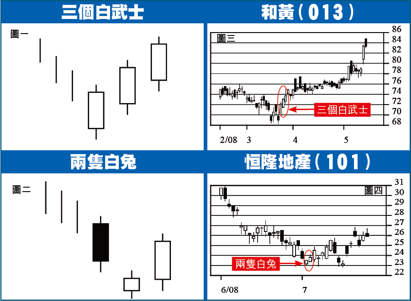 三個白武士的第二及第三支陽燭,開市價均位於上日陽燭的燭身之內,反映這兩日都有回吐壓力,股價低開,但好友終能力抗沽壓,使股價以接近全日高位收市,證明買氣旺盛,經得起考驗。