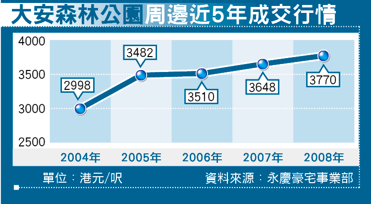永慶房屋附中直營店店長陳喻旻指出,其中大安森林公園周邊樓價,為3大公園中最高價。寶舖建設副總經理陳松林表示,大安森林公園近20年來只有6個新物業,依序為「艾非爾」、「廣陽豪門大第」、「幕府16」、「第凡內」、「安峰」及「勤美璞真」,開價更一路從呎價2600元上漲至呎價9751元,每推出新物業,樓價幾乎都有20%的漲幅。