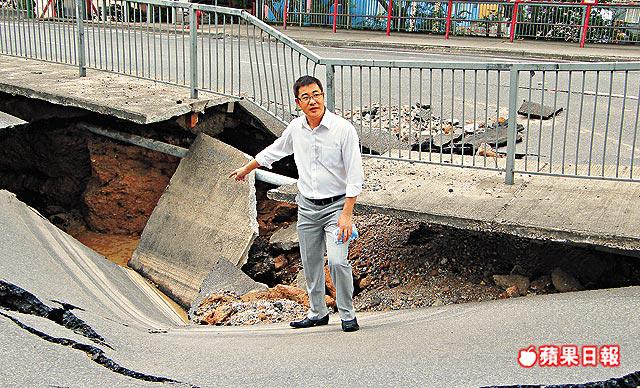 現場為寶鄉街近寶鄉橋路來回四線行車路面,昨晨近8時,地下一條450毫米直徑食水管疑因老化突然爆裂,大量食水夾雜沙泥湧出,水深最高近1呎。爆水管亦導致路面下陷,路中出現一個約6米乘3米、深兩米的大窪地,橫跨現場來回行車線,部份路中分隔鐵欄亦扭曲變形。