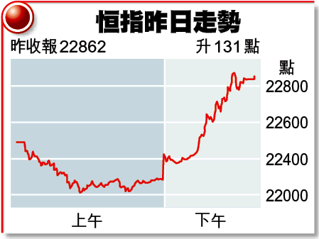國家主席胡錦濤表明中國在奧運後繼續推動經濟改革,外界解讀為放鬆從緊政策,令港股午後形勢180度逆轉,由早上最多挫523點,變成倒升131點收市,低位起計抽升約655點,收報22862點,升0.58%。市傳內地銀行獲准增加貸款額度,內銀股上演反擊戰,令H股指數同樣呈現V形反彈,由跌3.23%變倒升0.31%,收報12545點,升38點。