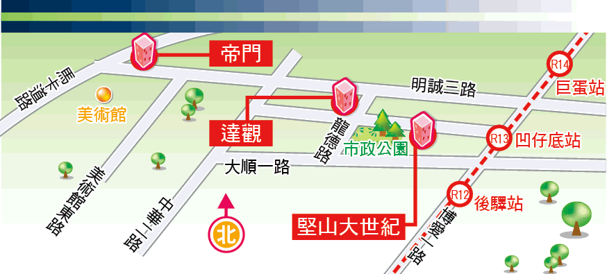 周邊主要設施:捷運紅線(已通車)、市府預定地、巨蛋