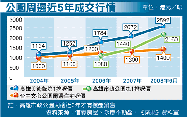 【張瑞傑、楊茲珺╱綜合報導】台中市與高雄市為台灣中、南部的2大都會,居住稠密度遠低於台北市,但是大型公園周邊的樓盤同樣搶手,地產開發商紛紛在公園第1排,推出創區域高價的頂級豪宅。台中文心森林公園、高雄市政公園與美術園區周邊,都是新興的豪宅聚落,不僅本地人購買自住,低廉的房價也吸引不少外地人投資置產。