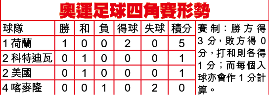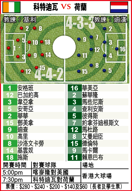 論首戰表現,荷蘭整體實力應是4隊之冠,而利物浦前鋒賴恩巴布將正選上陣,至於喀麥隆在頭場鬥美國,可憑較佳體力及狀態響勝門。本報訊