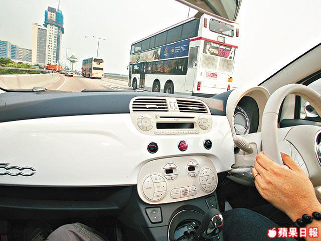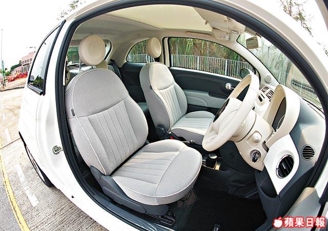 開初我仲以為外表的骰嘅Fiat500,車廂空間肯定異常擠迫,但實情原來相反。話說試車當日連我在內總共有三個人,最先安排生得高大嘅攝影師坐後座,沿途佢只係投訴過懸掛設定較硬,無詐過型話後座空間唔夠;及後到我試坐,竟然發覺有成40吋腰嘅肥仔都坐得落,仲要係唔逼嗰隻㖭!另外,車廂裝飾同軚盤等設備都用咗跟車身顏色一樣,加上由於屬頂級Lounge版,所以加咗個超大天幕式車頂,等你可以同車上嘅朋友有更多親近大自然機會。