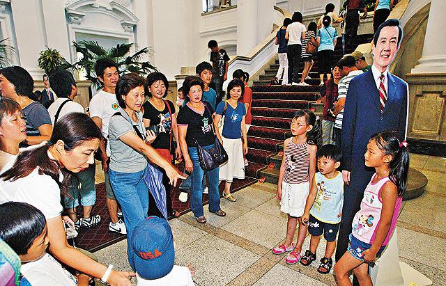 台灣總統馬英九上任後,大幅度解除參觀總統府的限制,昨日更首度開放總統府二樓以上區域,讓港澳及大陸遊客上樓參觀。馬英九自己昨日更現身和遊客握手,並抱小童嬉戲,盡顯親民形象,令現場遊客興奮尖叫。有大陸遊客見到馬英九真人,大讚他「長得真好看!」