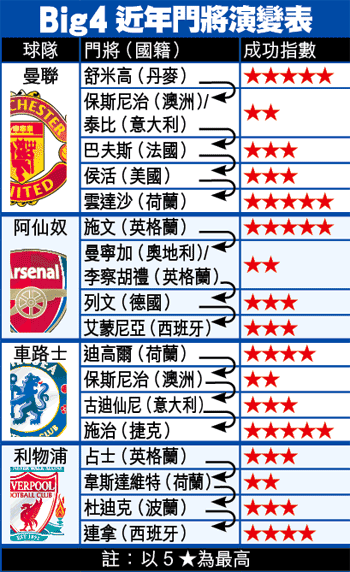 Big4之中,尤其曼聯領隊費格遜最唔信英格蘭本地門將,因近年從未給予過機會他們入隊試用;阿仙奴則自一代門神施文之後,領隊雲格總算曾對李察胡禮及泰萊兩名本土門將寄予厚望,不過最終全部離隊收場。至於車路士及利物浦,近年亦只得紅軍出過一名英格蘭門將占士。