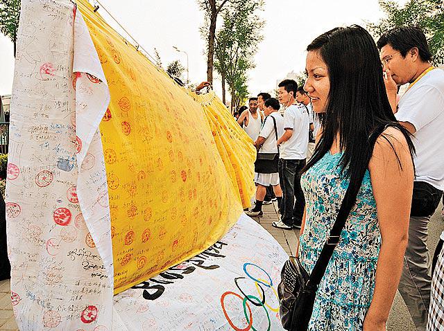 〔《蘋果》記者蔡元貴北京直擊〕這陣子,好像全中國的人都以不同方式參與奧運。陝西人李永宏昨日在奧運公園外展示一幅簽滿名、蓋滿政府單位印章的布幅,吸引很多途人圍觀和留言。他花了四年多時間,騎爛了一輛電單車,再騎另一輛電單車,走遍全中國2008個縣市,歷盡艱辛,收集了2008個官印,說是為中國加油。不過,他的熱血換來一盆冷水,北京公安禁止他展示布幅,令他無奈。