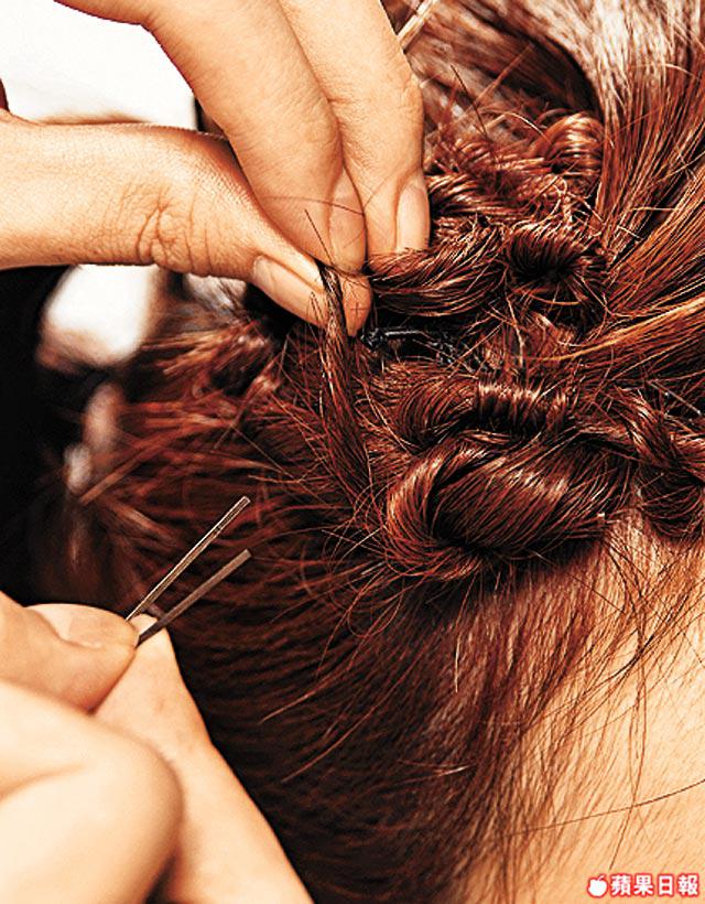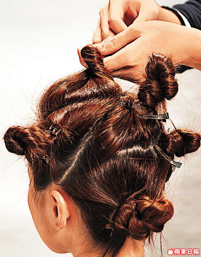 3.每份頭髮分成3至4小束,將小髮束扭實,順住扭實時的鬈曲形狀形成花紋以髮夾固定即成。