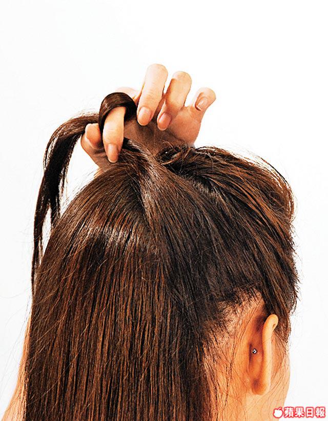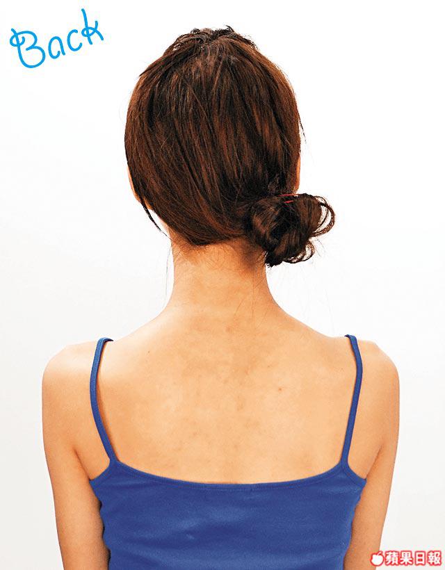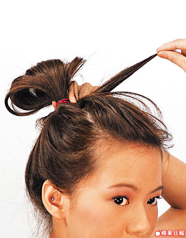 3.將全部頭髮向後拉紮死馬尾後束起成波波髻。用髻的髮尾包住橡筋位,加上花花橡筋裝飾固定即成。