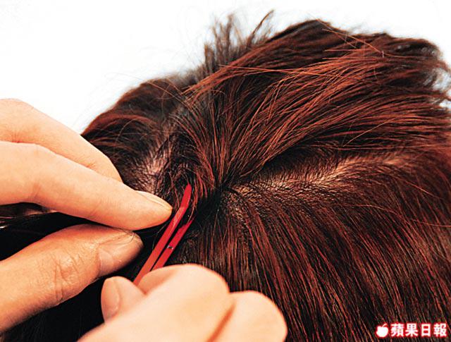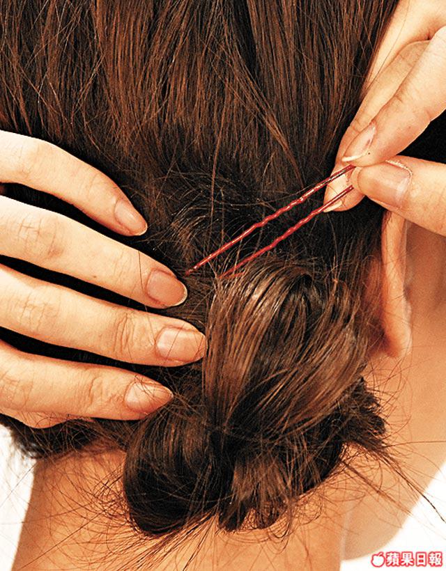 髮夾要順住髮束來夾,隱藏於頭髮中,整齊之餘會更穩陣。如果把髮夾夾在髮面打橫亂夾,看起來會好亂,而且容易滑下。
