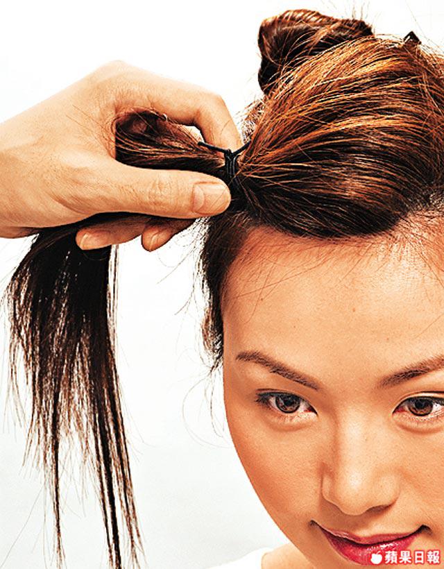 2.分別由耳仔頂端及耳後向後尾枕分出髮束,扭實並用髮夾固定。左右兩邊做法一樣。