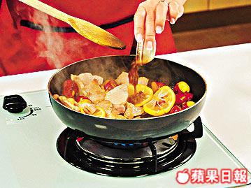 4.豬肉片放入鑊略煎後,加入檸檬片及番薯條炒勻。