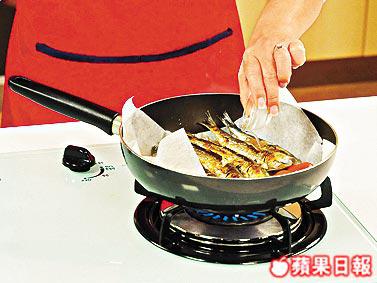 3.將焗爐紙放在易潔平底鑊入面,放入沙甸魚及車厘茄,開中火加熱2分鐘烘亁魚身,見有水和油不停滲出,可將魚反轉。
