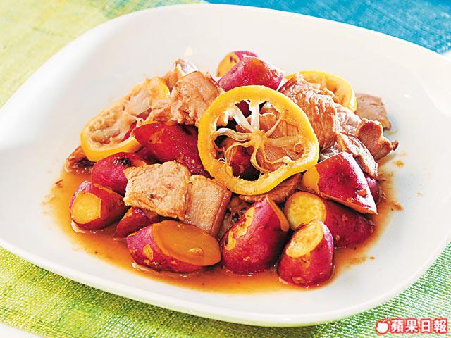番薯200至250克、豬肉200克、檸檬1/2個(切片)、橄欖油1湯匙、鹹蝦2湯匙、水1/2杯