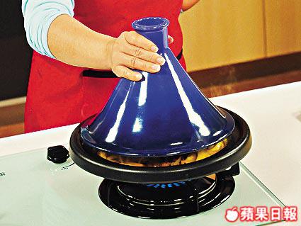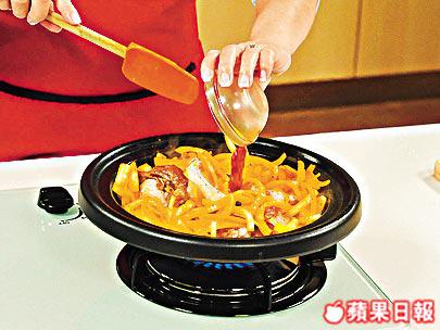 5.注入有氣蘋果汁及水,煮滾後轉小火冚蓋燜1小時至鴨熟即成。