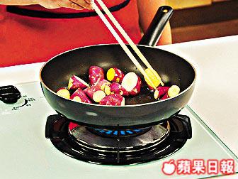 3.燒熱鑊開大火下橄欖油,放入番薯條略煎後撈起。