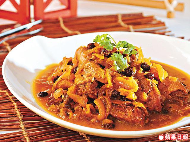 鴨1/2隻、洋葱500克(切絲)、豆蔻1茶匙、酒1湯匙、橄欖油/黃薑粉各2湯匙、有氣蘋果汁/水各100毫升、五香粉2茶匙、提子亁20克
