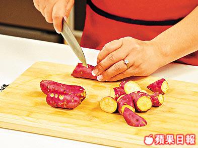 番薯切件後浸清水,令部份澱粉滲出,煮起來就更加爽口。